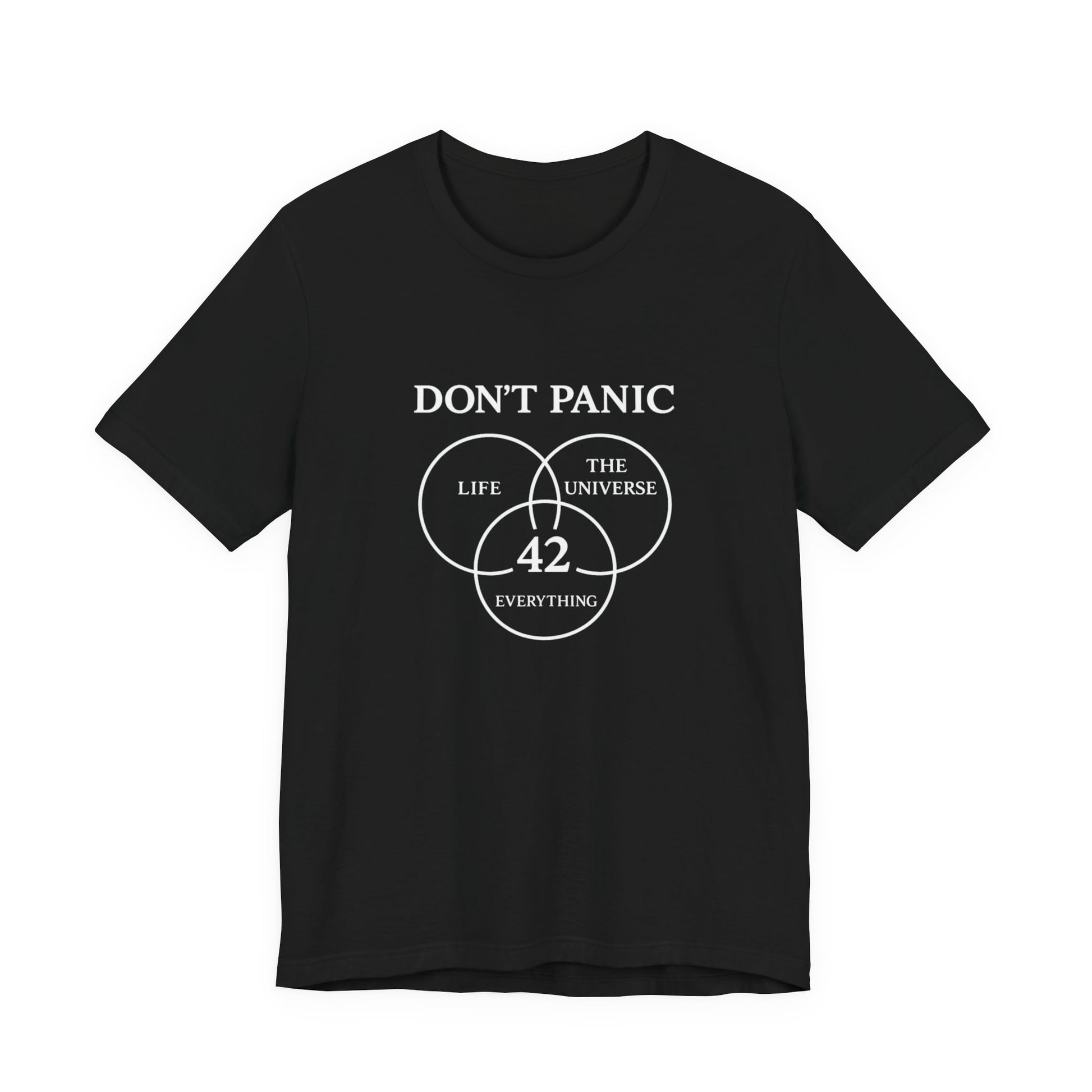 Mit seinem klaren Print „DON’T PANIC“ und dem ikonischen Venn-Diagramm verbindet das Shirt Humor, Philosophie und Popkultur zu einem Statement, das Understatement lebt.