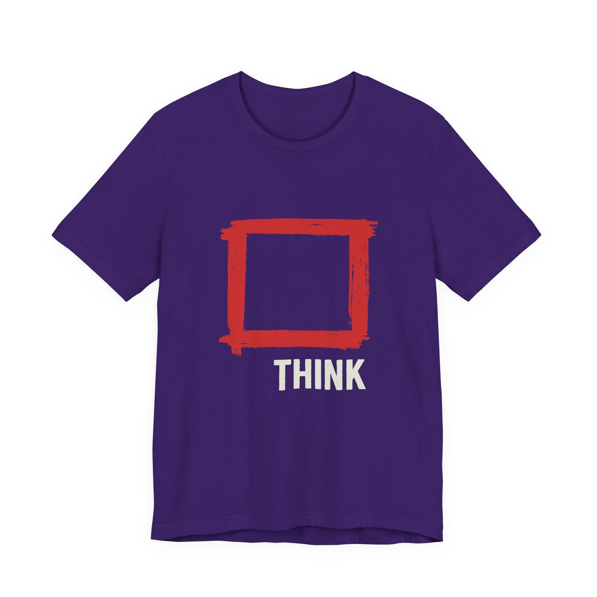 Das THINK-Shirt ist kein lautes Statement – es ist eine Einladung. Der handgemalte rote Rahmen über dem schlichten Schriftzug „THINK“ erinnert daran, kurz innezuhalten, zu reflektieren und bewusster durch den Tag zu gehen.